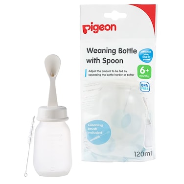 The Pigeon Weaning Bottle With Spoon D328 White 120ml is a convenient and mess-free way to introduce your baby to solids.