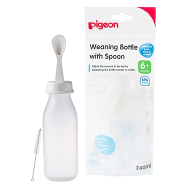 The Pigeon Weaning Bottle With Spoon D329 White 240ml is designed to help your baby transition from breastfeeding or bottle feeding to self-feeding.