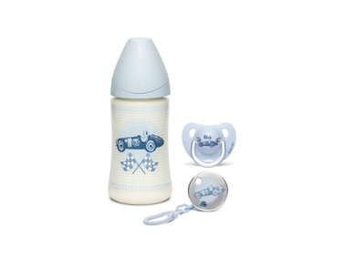 - Gift Set Suavinex containing 1 bottle 270ml , a lollipop evolution 0-6months size and pacifier clip jewel matching. Made in Spain,Approve by Spanish Society of Paediatric Dentistry,bpa free,Age group 0-6 mons