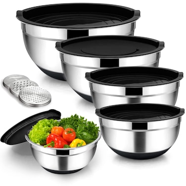 - <p><li>GREATER VALUE MIXING BOWL SET: Our bowls for kitchen is multipurpose valuable set that includes 5 different size mixing bowls – 5.5, 3.6, 2.9, 2.1, 1.6, QT. The lid of the 3.6 QT bowl has a removable center, where can be placed one of 3 graters to grate something. This essentials baking bowls can cover the basic needs of your kitchen<p><li>DURABLE STAINLESS STEEL : Mimelon Metal bowls set is constructed of mirror-finish interior and matte-finish exterior, Made of top gauge stainless steel, mixing bowls with lids are durable to last a lifetime - Ideal for everyday tasks Its is also dishwasher and freezer Safe.<p><li>AIRTIGHT LIDS WITH NON SLIP BOTTOM : Flat silicone grip portion on the bottom would avoid the metal bowls from slippage while mixing, beating and whipping and Airtight Lids that fit tightly to keep an airtight seal to keep food fresh<p><li>EASY TO CLEAN WITH MULTIPLE INTENTS: Steel bowls are prefect to uae as better breader shaker and toss salads, stir, whip, knead dough, marinate and store. Simple to clean by hand and dishwasher safe. Please hand-wash the lids to minimize exposure to heat.<p><li> MAKES A GREAT GIFT: What better gift is there than easier meal preping ? Our airtight sealable bowls containers are the perfect choice for weddings, housewarmings, bridal showers, birthdays, Christmas, graduations, and more. They come in gift packaging to make gifting easy<p><li>DURABLE STAINLESS STEEL : Mimelon Metal bowls set is constructed of mirror-finish interior and matte-finish exterior, Made of top gauge stainless steel, mixing bowls with lids are durable to last a lifetime - Ideal for everyday tasks Its is also dishwasher and freezer Safe.<p><li>AIRTIGHT LIDS WITH NON SLIP BOTTOM : Flat silicone grip portion on the bottom would avoid the metal bowls from slippage while mixing, beating and whipping and Airtight Lids that fit tightly to keep an airtight seal to keep food fresh