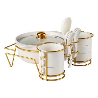 This elegant Soup Set with Matt Fleck Gold Stand includes 15 pieces to elevate your dining experience. The set features a luxurious gold stand with a matte finish that adds a touch of sophistication to any table setting.