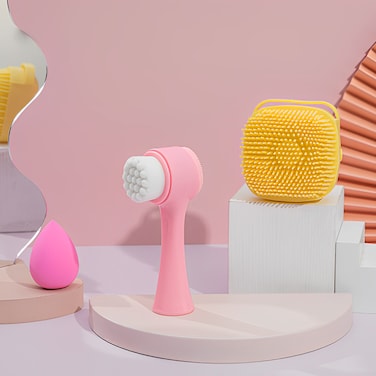 Introducing our multifunctional skincare tools designed to elevate your beauty routine effortlessly. The Facial Cleansing Brush features ultra-soft nylon bristles that delicately remove dirt and makeup when paired with your preferred cleanser, while the silicone side gently exfoliates to reveal soft, smooth skin. Achieve flawless makeup application with our Makeup Sponge, a professional-grade tool for seamlessly blending liquid foundation across the face. For deep cleansing and gentle facial massage, our Silicone Face Wash Makeup Brush offers innovative pore-cleansing technology and easy makeup removal. Crafted from soft silicone, these tools are skin-friendly and effective, suitable for daily use. Compact and portable, they are perfect for on-the-go skincare, ensuring you maintain radiant skin wherever you are. Elevate your skincare regimen with these essential tools for a healthier, glowing complexion.