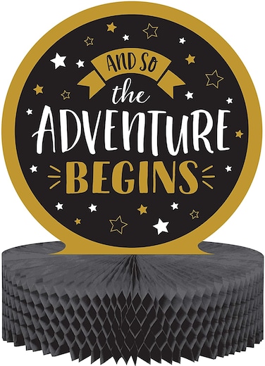 Light up your grad celebration with this Adventure Begins Centerpiece. Featuring an elegant black and gold design with the phrase "And So The Adventure Begins Inches centered on top of a honeycomb base, this centerpiece is the Perfect way to celebrate your grad. Measuring 9 Inches x 12 Inches and sold individually, this centerpiece can be paired with any other Adventure Begins party supplies.