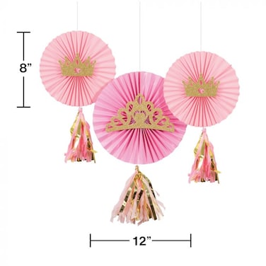 These beautiful pink paper fans with tassels and glitter attachment will surely complete your princess -themed party. (Includes: 1pc 12 Inches fan and 2pcs 8 Inches fans, 3 gold glittery princess crowns and 3 tassels.