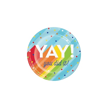 Serve a fabulous piece of chocolate cake at your party on the Rainbow Grad Dessert Plates. These sturdy paper plates measure 7 Inches and feature confetti and the words "YAY! You Did It! Inches with a rainbow theme. Sold in packs of 8, these disposable paper plates coordinate with all Rainbow Grad party supplies