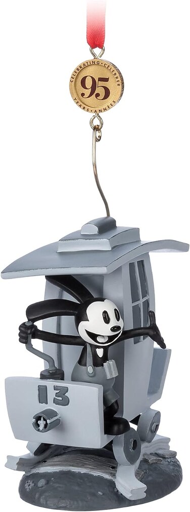 Walt Disney's original animated cartoon star, Oswald the Lucky Rabbit, celebrates his 95th Anniversary aboard a ''toontown'' trolley on this fully-sculpted Sketchbook Ornament.