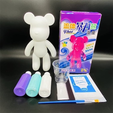How to make Fluid Violent Bear: 1. Use the brush to dip the acrylic paint to brush the background color at the joint of each part of the bear embryo, in order to make the fluid effect better and avoid the problem of white space at the interface. 2. Match the color with the measuring cup, mix the pigment several times in small quantities, and start pouring the pigment on the bear embryo. 3. The whole bear embryo is filled with pigment, and the normal natural air drying is completed.