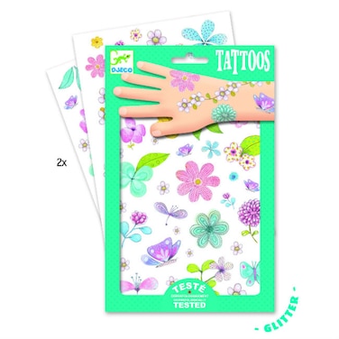 - <p>Dermatologically tested tattoos in glittery flowers &, butterflies designed by Djeco. Suitable for children of 3 years and above<p>Includes 2 different tattoo sheets 140 x 210 mm.<p>Box size 14,5 x 23 cm.<p>
