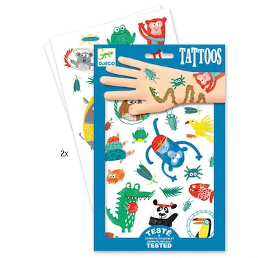 - <p>Animal themed temporary tattoos by Djeco.<p>Contains 2 different sheets of dermatologically tested tattoos.<p>Suitable From 3+ years. <p>Dimensions 14 x 23 cm<p>