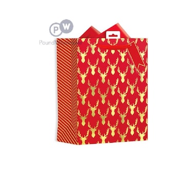 Featuring a beatiful Christmas red decorated with golden stags with antlers, the Stags Head Christmas Gift Bag from the Giftmaker range is suitable for accommodating large gifts and Christmas presents for friends and love onces during the festive period.