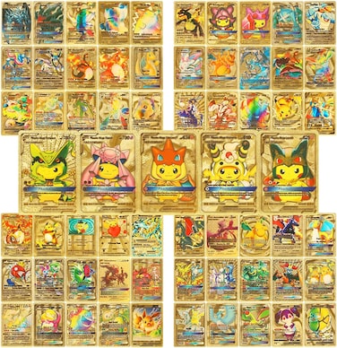 Gold Pokemon Cards Golden Foil Set (110 pcs) including 17 V Series Cards, 43 GX Rare Cards, 6 EX Cards, 28 Vmax Rares, 7 Basic Cards, 7 Tag Cosplay Cards, 1 DX Card, and 1 Athletic Card