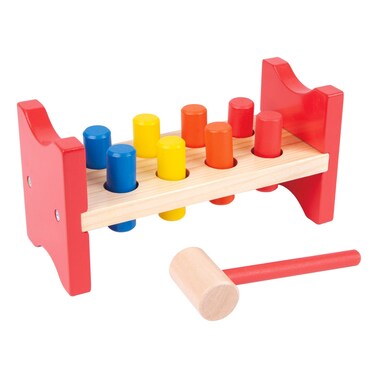 It features a colourful design with multiple holes and a hammer. Kids can use the hammer to hit the pegs through the holes, helping to develop their hand-eye coordination and fine motor skills.