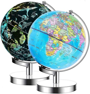 2 In 1 Globe: Daytime view world globe; Night view stars and constellations globe. Illuminated world globe features switch-controlled LED lights so it turns into beautiful lighted globe for nighttime learning.