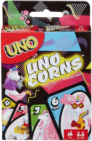 Product Description: The world loves UNO and the world loves unicorns now with the UNOcorns Card Game, you can have both in one great game It's the matching game you love, now with cards that feature delightful images of colorful and magical unicorns. Players take turns matching a card in their hand with the card shown on top of the deck either by color or number. Special action cards deliver game-changing moments as they each perform a function to help you defeat your opponents. These include Skips, Reverses, Draw Twos, color-changing Wild and Draw Four Wild cards. When you're down to one card, don't forget to shout "UNO " the goal is to get rid of all the cards in your hand, and the first player or team to 500 points wins. for many years, UNO has been the beloved card game that's easy to pick up and impossible to put down, and now featuring mystical unicorns, it's irresistible Contains 112 cards plus instructions. for 2 to 10 players, ages 7 and older. Colors and decorations may vary.