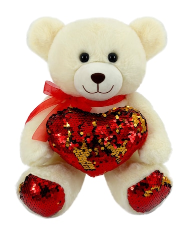 Bear with Sequins Heart Cream 31cmt. The Perfect valentines gift for your loved ones. Sold individually in an assortment of colours, brown and cream.