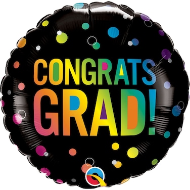 Accent your graduation themed party with this 18in round Congrats Grad Ombre Dots foil mylar balloon. The Perfect balloon for your graduation party, this 18in Qualatex party balloon is great for setting the scene! This balloon includes a self-sealing valve, preventing the gas from escaping after it's inflated. The balloon can be inflated with helium to float or with a balloon air inflator. Balloon arrives uninflated.
