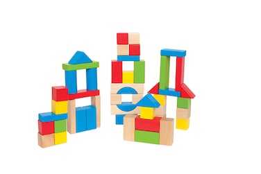 Maple Wood Kids Building Blocks by Hape | Stacking Wooden Block Educational Toy Set for Toddlers, 50 Brightly Colored Pieces in Assorted Shapes and Sizes