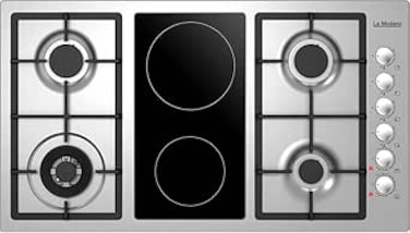La Modano Stainless Steel Gas & Electric Hobs 90 CM With Knob Control, 4 Burners, 2 Ceramic Heating Zones, FFD, Cast Iron Pan Supports, Automatic Ignition - LMBH904GV Silver