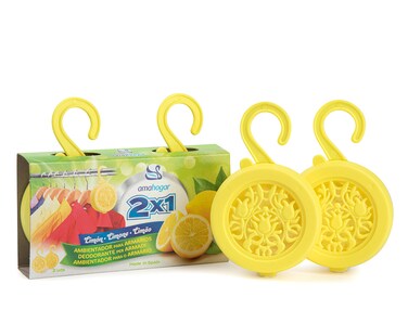 The 2 x 1 air freshener consists of two wardrobe hangers with scented tablets to keep your clothes in a scented environment with one of the four classic scents: rose, pine, lemon and lavender.