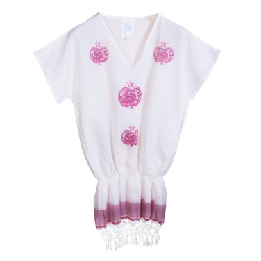 Based on the licensed works of the artist Canan Berber, we designed useful, modern products for you from life.Made of 100% Cotton fabric.Hemline with tassels.Pink pomegranate pattern on white dress.Sizes: L / X-Large