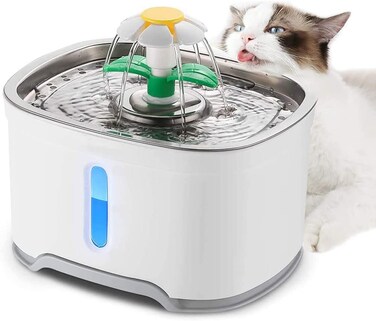 - 【Water Level Window with LED Indicator】 Transparent & convenient water level window,timely remind you to add water.Soft blue LED indicator design will attract your pets drink more. With Power failure protection,Variable led display:full of water is blue and lack of water is red.