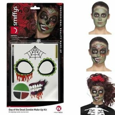 Complete your Day of the Dead outfit with this Horror Zombie Halloween Make Up Kit! Includes Transfers, Face Paint, Crayon & Applicators. The makeup is all top quality hypo allergenic, which will give you a even colour base and is easy to remove.