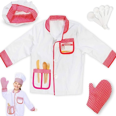 Get your little ones excited about cooking with this Chef Costume Dress-Up Set from FITTO. This set includes all the essential accessories for a chef costume, such as a chef hat, apron, oven mitt, hot pad, wooden spoon, rolling pin, and a recipe card. Made with high-quality materials, this costume set is durable and comfortable for hours of imaginative playtime. Whether it's for a Halloween costume or just for fun, this Chef Costume Dress-Up Set is perfect for encouraging children to use their imagination and creativity while engaging in role-playing activities.