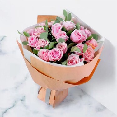 20 Pink Roses Eucalyptus Leaves Contrast Paper Wrapping Tied with a Ribbon Bow