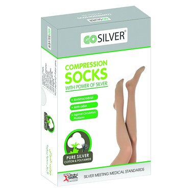 Go Silver Compression socks with the power of Silver, combination of cotton and polyamide with pure silver, with compression percentage 18-21 mm HG which is suitable for people have the varicous veins,it is with action as compression socks and anti-bacterial, anti bad odor, and against circulation problems.