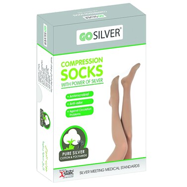 Go Silver Compression socks with the power of Silver, combination of cotton and polyamide with pure silver, with compression percentage 18-21 mm HG which is suitable for people have the varicous veins,it is with action as compression socks and anti-bacterial, anti bad odor, and against circulation problems.