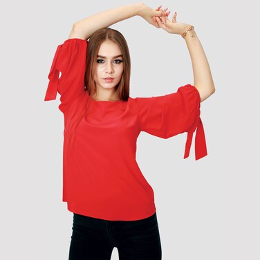 KIDWALA Size 36, Women'S Tops, Tees & Blouses Tie Sleeves, Red Blouse, Round Nick Top With 3/4 Quarter Sleeves Length, Waist Length Blouse