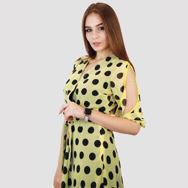 KIDWALA Size 46, Women'S Wrap Long Polka Dots Print Ladies Yellow & Black Dress, Lantern Sleeves, Bottom Ruffled Design, Belted Maxi Wrap Dress, Surplice Neckline Night Dress