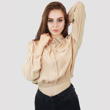 KIDWALA Size L, Women'S Tops, Tees & Blouses Beige Cropped Front Two Pocket Bomber Jacket Elastic Waistband & Wristband Blouse With Collar Neckline With Long Sleeve, Buttons Up Top, Crop Top