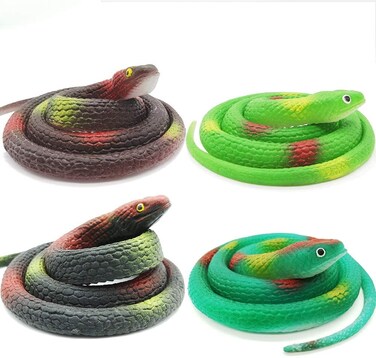 4 Pieces 29 Inch Realistic Rubber Snakes, Pranks, Halloween Decoration, The Funniest Gift for Children Featuring: Quality soft rubber Great for gifts Whether it is molding or physical feel, are highly imitate the real snake, make these toys snakes more realistic and terror, and children are very fond of them, for scary, mischief and various games Nice decorations These realistic snakes can be applied to decorate your garden, wrap it around branch or place it on the grass, which can help scare birds and beast. Widely application: The creepy snakes toys are not only great gift, giveaways, rewards, game prizes give kids and but also suitable decorate for garden, dining table, theme party and so on. Package includes: 4*29 Inches mix color realistic rubber snake