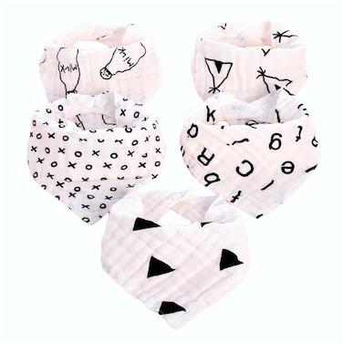 - Our Exclusive range of Organic Cotton Muslin Bandana Bibs are super soft and have adorable designs. These organic cotton made bibs are soft on your little one’s tender and delicate skin. Comes in a set of 5 with different styles which compliments to your baby’s dress! Black and White colour with fun designs are unisex and a perfect gift for boy and girl both. SPECIFICATIONS • Product Dimensions(cm) : 453232 • Product Weight(kg) : 0.025 • Packing Dimensions(cm) : 26172.5 • Packing Weight(kg) : 0.13 • Material : Cotton • Package Includes : 5*Bibs FEATURES • 100% Organic Cotton for that extra comfort to the baby • Made from adjustable nickel free snaps. All Metal used on Bibs and Pacifier Holders is Nickel-Free, No BPA, No Lead, No Phthalates, No Latex. • 5 patterns in one pack to match baby’s dress and compliment it