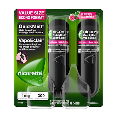 - • Nicorette QuickMist 1mg, Cool Berry, Duo Pack, 150 Sprays Each x 2 helps relieve smoking cravings • Gets to work on tough smoking cravings and withdrawal symptoms in 60 seconds to help you quit smoking for good • This Nicotine Replacement Therapy (NRT) and smoking cessation aid has 1 mg of nicotine per spray • Approximately 300 sprays for two bottles and great tasting Cool Berry flavour • Increase success of quitting smoking by using a support or counseling program with Nicorette QuickMist spray
