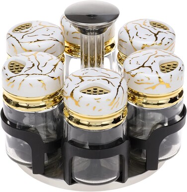 Revolving Spice Rack Organizer with 6 Glass Jar Bottles Set for Herbs, Salt & Pepper, Glass Condiment Set with 360° Rotating Holder (White & Golden)