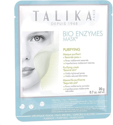 Designed to fight excess sebum and small skin imperfections (dilated pores, redness, blurred complexion), our Bio Enzymes Mask Purifying offers an immediate radiance boost in only 15 minutes. Created in 2008, it is the first biocellulose purifying mask, based on restorative techniques. Within 15 minutes, the skin is purified, detoxified and shine-free.The secret of the effectiveness of our Bio Enzymes Mask range lies in the combination of natural active ingredients and biocellulose. This ultra-pure biotech material made of nanofibres is the result of the enzymatic fermentation of coconut water. The 3D structure of biocellulose retains a high level of active ingredients, which are optimally distributed in the epidermis.Our Bio Enzymes Biocellulose Mask Purifying offers a second skin effect during use. The paraben-free formula of this facial mask contains 4 natural active ingredients: argan nut to regulate sebum secretion, haritaki extract, a purifying and antibacterial plant, willowherb extract to refine and tighten pores and magnolia, with antioxidant and soothing benefits.Bio Enzymes Mask Purifying is used occasionally for an immediate boost or twice a week for a long-lasting purifying treatment. Leave the mask on for 15 to 30 minutes and remove. Finish this moment of care and relaxation by massaging the facial skin to allow the excess cleansing product to penetrate.Since 1948, Talika has been offering specialist eyelash and skin care, and more recently, specific facial treatments including electro-beauty. We are constantly innovating to offer treatments that reveal the natural beauty of each woman at every stage of her life. With an integrative approach, Talika products are the result of a combination of cutting-edge technologies and age-old traditions, creating targeted treatments and new beauty routines.