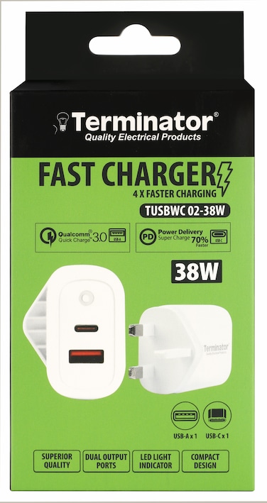Terminator brand USB Wall Charger with 38W Fast Charging USB-A (QC3) & USB-C (PD) with 13A Plug & Blue Light Indicator-White