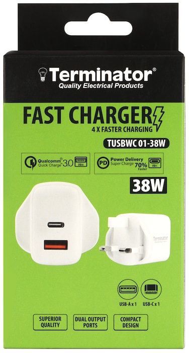 Terminator brand USB Wall Charger with 38W Fast Charging USB-A (QC3) & USB-C (PD) with 13A Plug & Compact Design-White