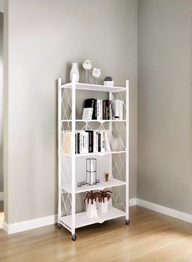 vsell24 Foldable Storage Shelf - Durable Metal, Easy Assembly, Mobile with Lockable Wheels, 5-Tier White Finish