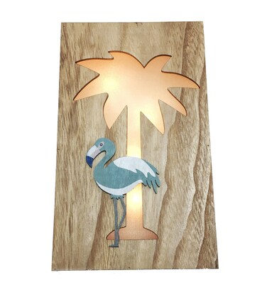 • Light up LED wooden coconut palm tree and flamingo design plaque.