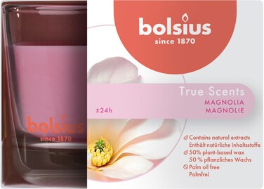 Palm Oil Free. Cotton candle wicks. Enjoy up to 43 hours of burn time What you see is what you smell with Bolsius. From all time favorite classics to new trendy scents: the Bolsius True Scents collection offers a fragrance for everyone. Do you like our creamy vanilla, the musky magnolia, the exquisite oud, the fresh lavender, or the fruity pomegranate? These fragrances will help you bring nature into your home in the purest and eco-friendliest way. Guess what? Bolsius candles are made of natural extracts, 50% plant-based wax and are Palm Oil Free. So you can expect the usual high quality Bolsius standard in each one of these candles. The high quality cotton wicks also ensure very low smoke emission. Discover the Magnolia fragrance. An absolute classic! With the soft fragrance of magnolia, white flowers and a hint of musk, you'll be imagining yourself in a field of flowers on a lovely summer's eve. Material: Glass & Premium Grade Paraffin Wax Dimensions: Small: 50/80mm Or Medium: 63/90mm Or Large: 95/95mm Color: Pink Origin: The Netherlands