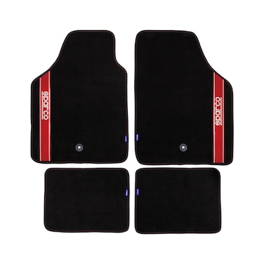 - Material: Polyester + PVC backing. Front: 650 x 470 mm / Rear: 300 x 400 mm. Weight: 2 kg. Durable and aesthetic. Non-skid backing for a better drive and greater comfort. Sparco logo detail. Front mats with a hole for screw insertion blocks rug. 450g/sqm good quality carpet. Set includes 2 front mats & 3 rear mats. Universal sizes. Sparco Header Card package.