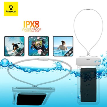 - Take your smartphone on an underwater adventure. The Baseus AquaGlide waterproof phone case is made of PVC material, so it won't adversely affect the camera or facial recognition function. The touchscreen also works flawlessly underwater. Thanks to the ergonomic lanyard, you can comfortably hang the accessory around your neck. The seal guarantees excellent protection against flooding, and the innovative design of the cover effectively protects the phone. The product features IPX8 water resistance, allows immersion up to 30 meters and is compatible with devices whose diagonal does not exceed 7.2".