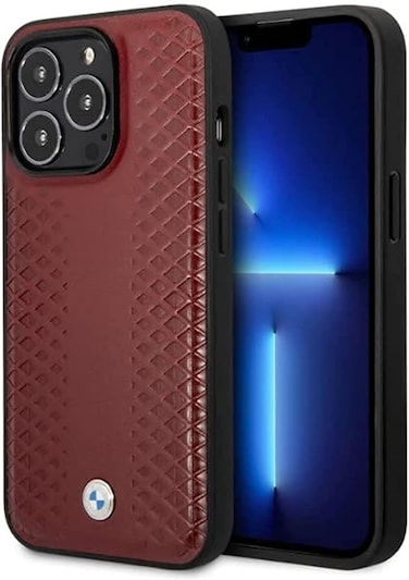 CG Mobile BMW Compatible With Magsafe Signature Collection Genuine Leather Case With Diamond Hot Stamp Pattern Wireless Chargeable/Protective Cover Compatible With iPhone 14 Pro Max 6.7" (Burgundy)