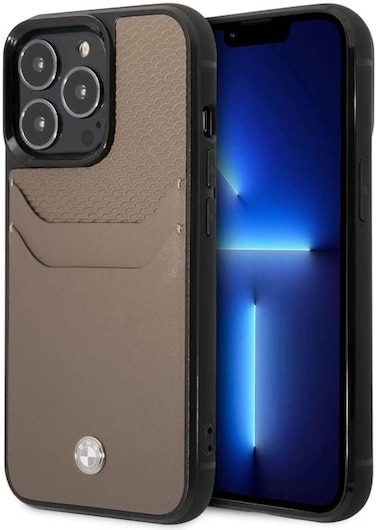 CG Mobile BMW Signature Collection Genuine Leather Case With Cardslot Embossed Pattern, Stylish, Slim-Fit, Anti-Scratch, Bumper Protection, Compatible with iPhone 14 - Taupe (Pro Max)