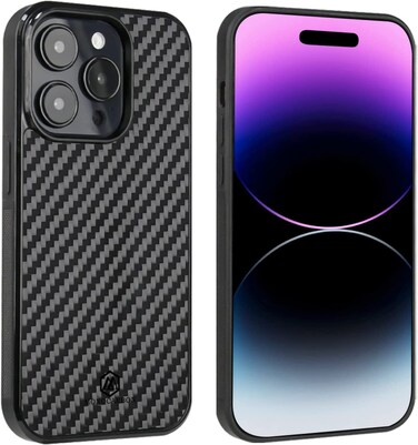 MONOCARBON Carbon Fiber case for Apple iPhone 14 Pro Max is made with Real Carbon Fiber material for the ultimate balance of a Slim case with Heavy Duty Military Grade Drop Protection and Scratch Resistance. The case offers a Solid Grip via a unique design with Premium TPU 3D Grips on sides for a Non-slip secure hold. Raised edges protect the camera when laid down on Flat surfaces.