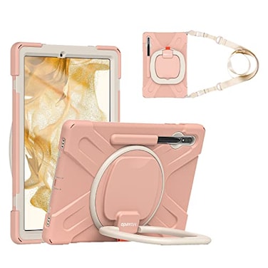 Moxedo Shockproof Rugged Colorful Case with 360 Rotating Kickstand and Shoulder Strap Compatible for Samsung Galaxy Tab S7 Plus 12.4-inch 2020 / S8 Plus 2022 (T730/T970/X800) (Rose Gold)