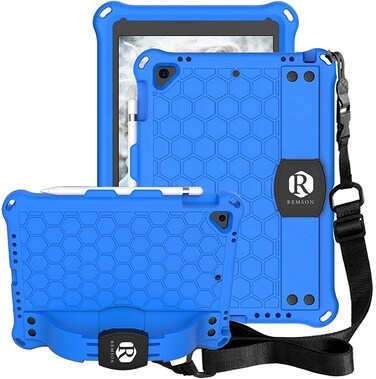 Remson Apple iPad 10.2 (2019-7th Generation / 2020-8th Generation) Honeycomb Stand Handle Shockproof Drop Protection With Shoulder Strap Back Case Cover (Blue/Black)